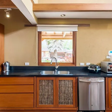 La villa dispose d'une cuisine complète dotée de micro-ondes, d'une cafétière/théière électrique et d'un réfrigérateur. - ❓